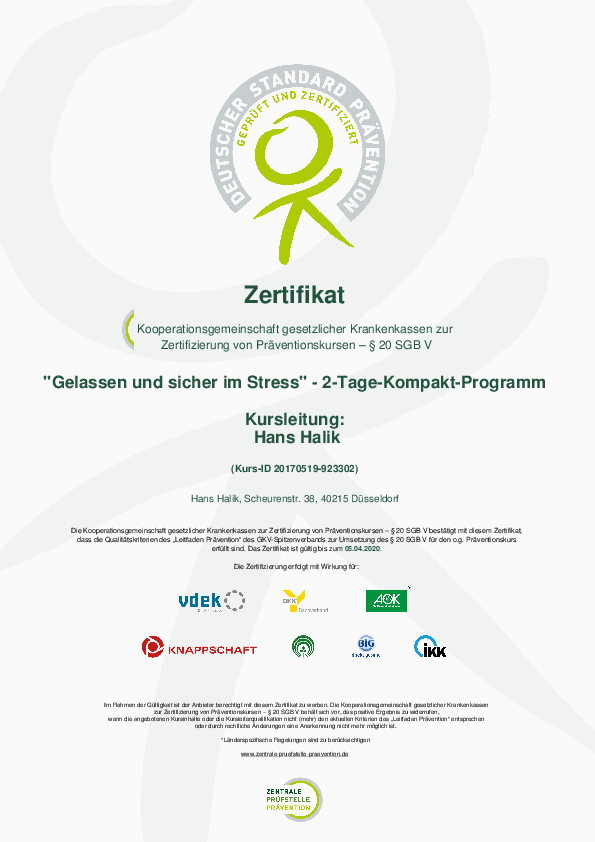 In diesem Kurs lernen Sie, wie Sie Belastungen in Beruf und Alltag gelassen und sicher meistern können. Sie erfahren, wie Sie sich von belastenden Gedanken distanzieren und förderliche Einstellungen entwickeln können. Sie entwickeln mit Hilfe der Gruppe neue Ideen zum Umgang mit Alltagsbelastungen und planen konkrete Schritte zu deren Umsetzung. Sie entdecken Möglichkeiten, wie Sie in Ihrem Alltag Erholung finden und neue Kraft tanken können.